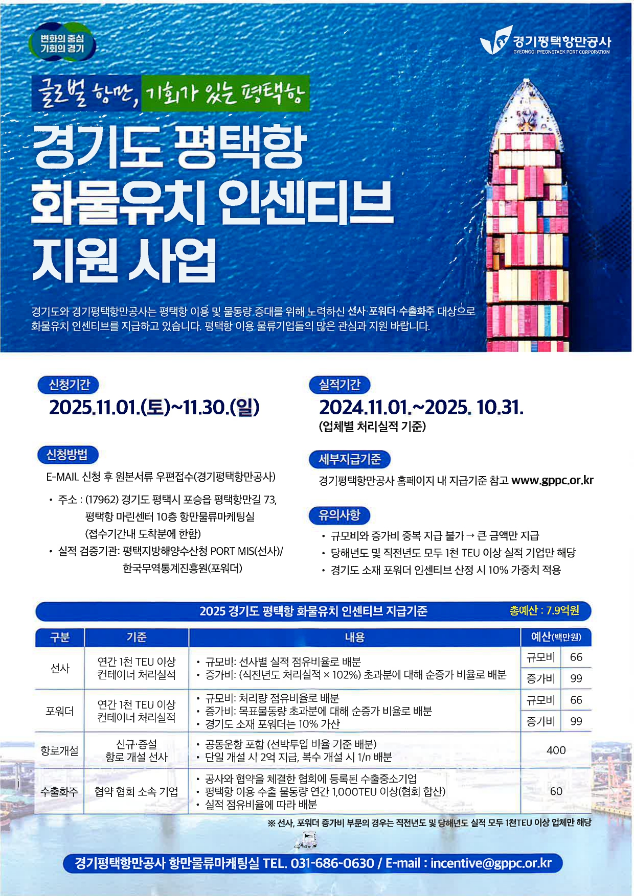 경기도와 경기평택항만공사는 2025년 경기도 평택항 화물유치 인센티브 지급을 통해 평택항 이용기업의 물류비를 지원하고자 하오니 많은 관심과 참여 바랍니다.