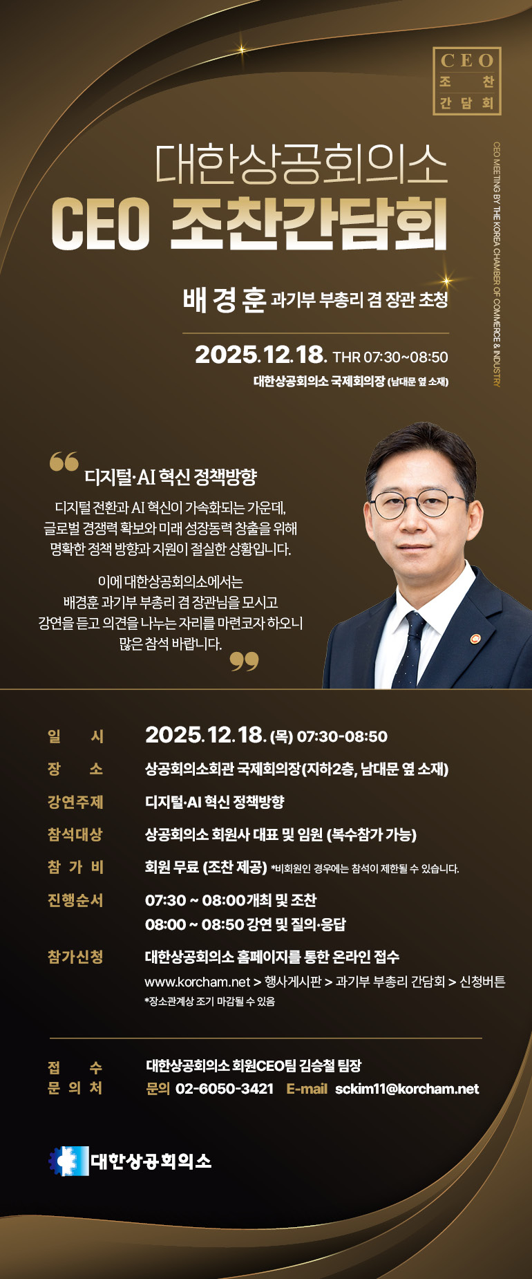 다가오는 12월 18일(목) 오전 7:30, 대한상의 국제회의장에서 배경훈 과학기술정보통신부 부총리 겸 장관을 모시고 정부의 디지털·AI 정책 방향과 기업 지원방안을 논의하는 ‘CEO 조찬 간담회’를 개최합니다. 일시: 2025.12.18(목) 07:30~08:50 장소: 대한상의 국제회의장(B2) 대상: 전국 상의 회원기업 대표 및 임원 약 300여 명