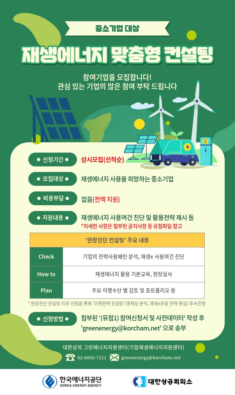 | 제목 | '중소기업 재생에너지 맞춤형 컨설팅' 모집 안내 | ||