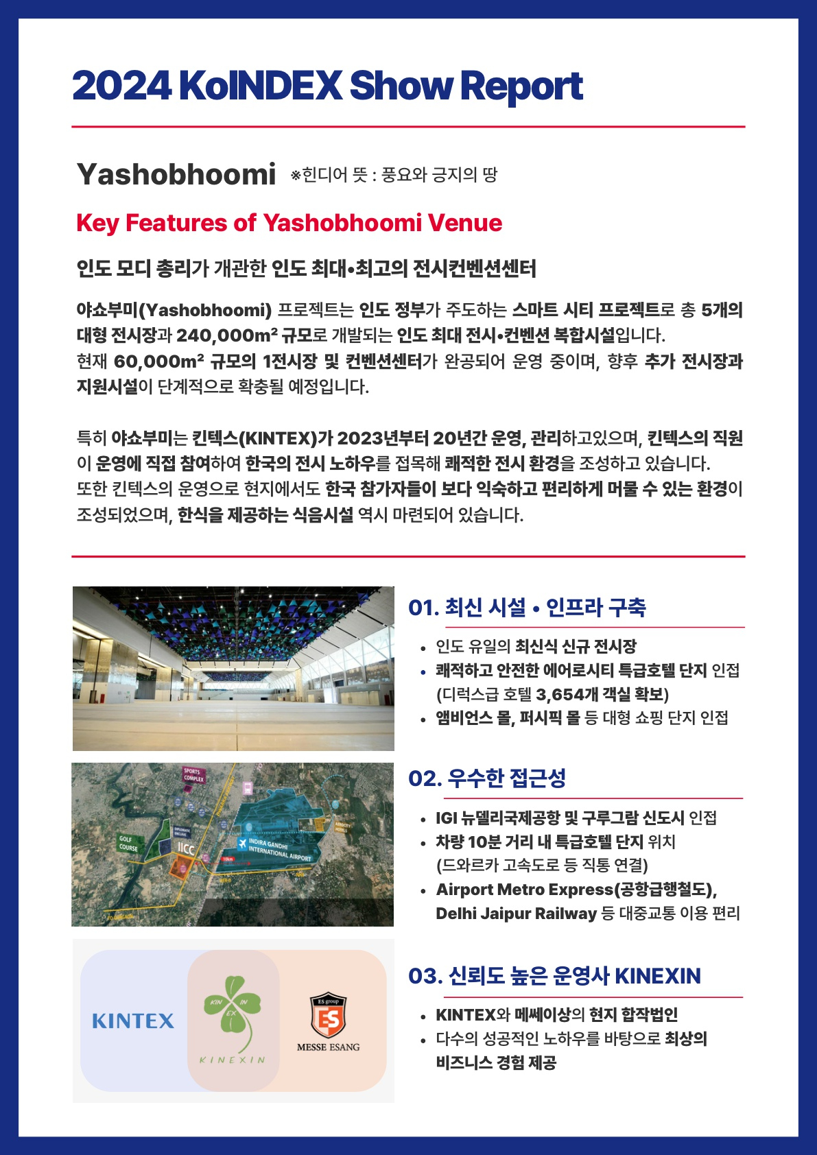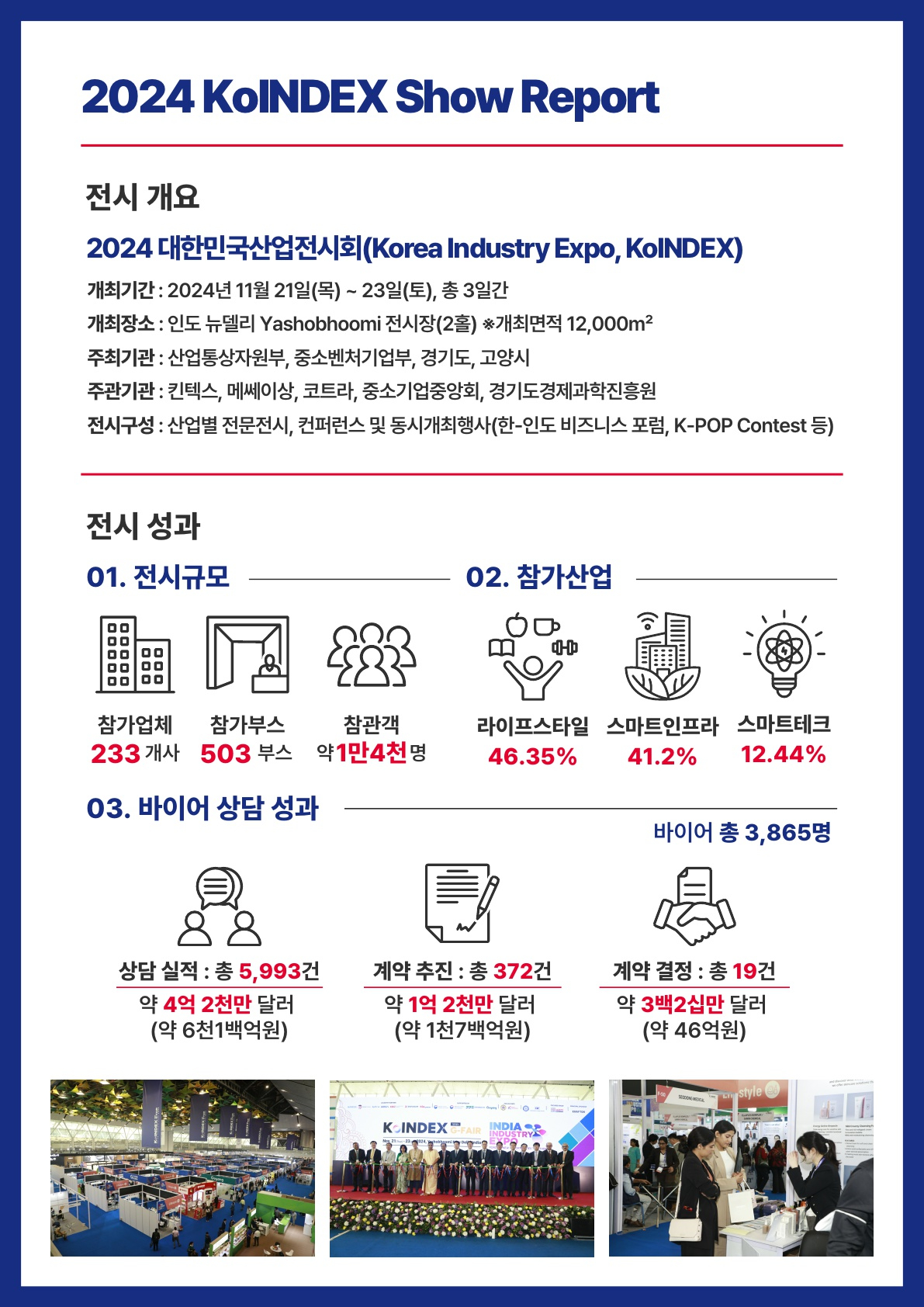 킨텍스에서는 2026년부터는 매년 개최되어 대한민국 중소기업의 인도시장 진출을 지원할 예정입니다. 2024년 인도 뉴델리에서 처음 개최된 「대한민국산업전시회(KoINDEX)」는, ※ 2024 KoINDEX 주요 실적: 233개사 참가 / 1.4만명 참관 / 바이어 4천명 / 상담실적 4.2억달러 / 계약추진 1.2억달러 달성하였습니다.