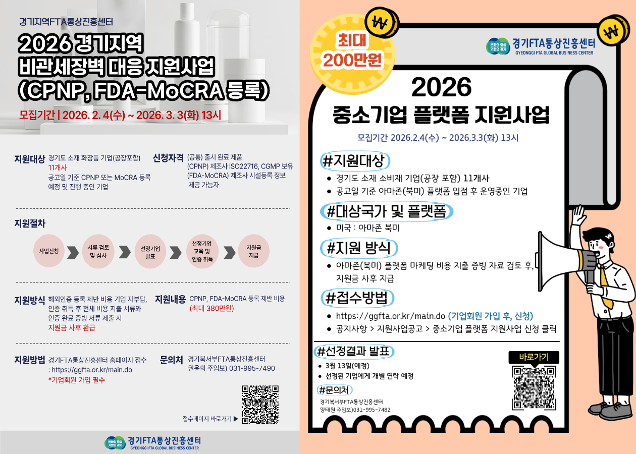| ‒ | 「2026 경기지역 비관세장벽 대응 지원사업」 및 「2026 중소기업 플랫폼 지원사업」안내 |