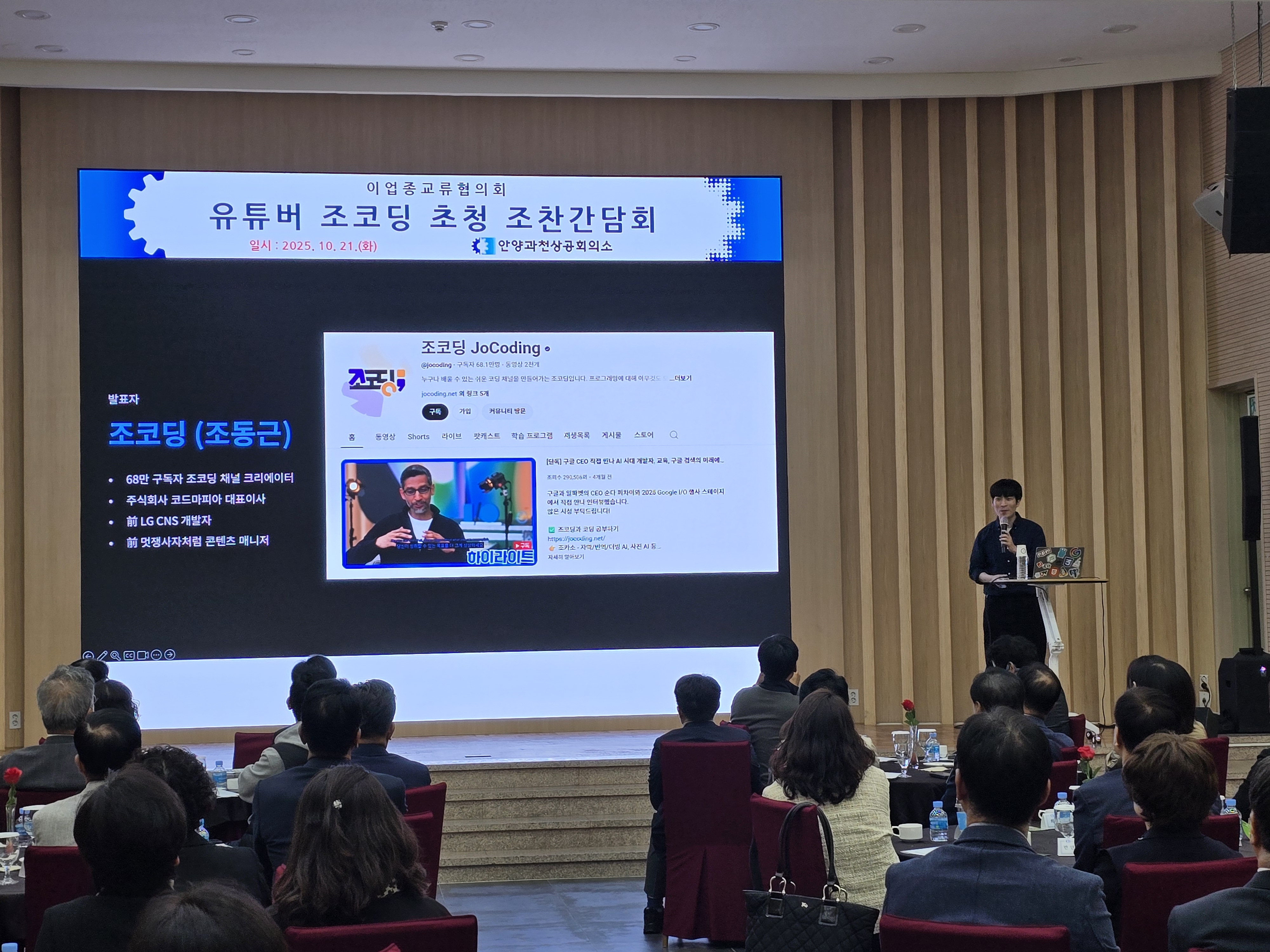 안양과천상공회의소(회장 배해동)는 10월 21일(화) 조동근(조코딩) ㈜코드마피아 대표를 초청하여 【요즘 AI, 어디까지 왔을까?】라는 주제로 조찬간담회를 개최하였다.