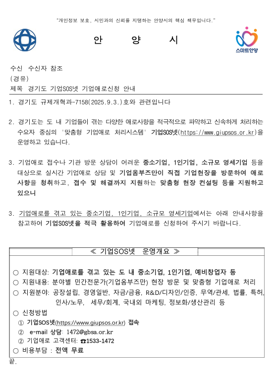 제목 | [안양시] 경기도 기업SOS넷 기업애로신청 안내 | ||