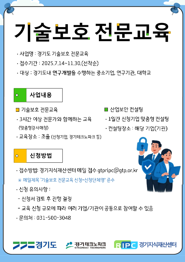 제목 | [경기테크노파크] 기술보호 전문교육교육 및 컨설팅지원사업 안내 | ||