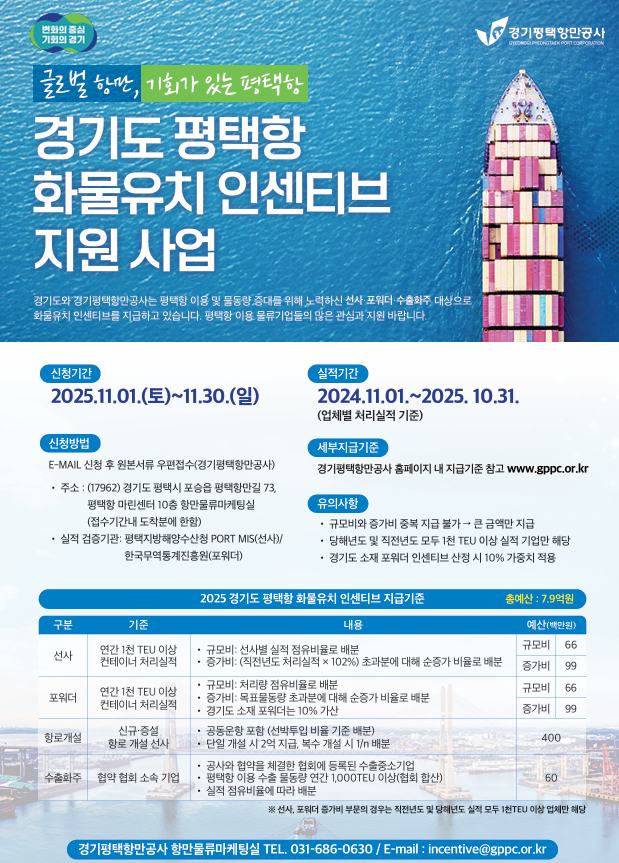 | 제목 | 경기도 평택항 화물유치 인센티브 지원사업(수출화주) 간담회 개최 안내 | ||