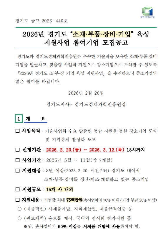 | 제목 | 2026년 경기도 소부장 기업육성 지원사업 참여기업 안내 | ||