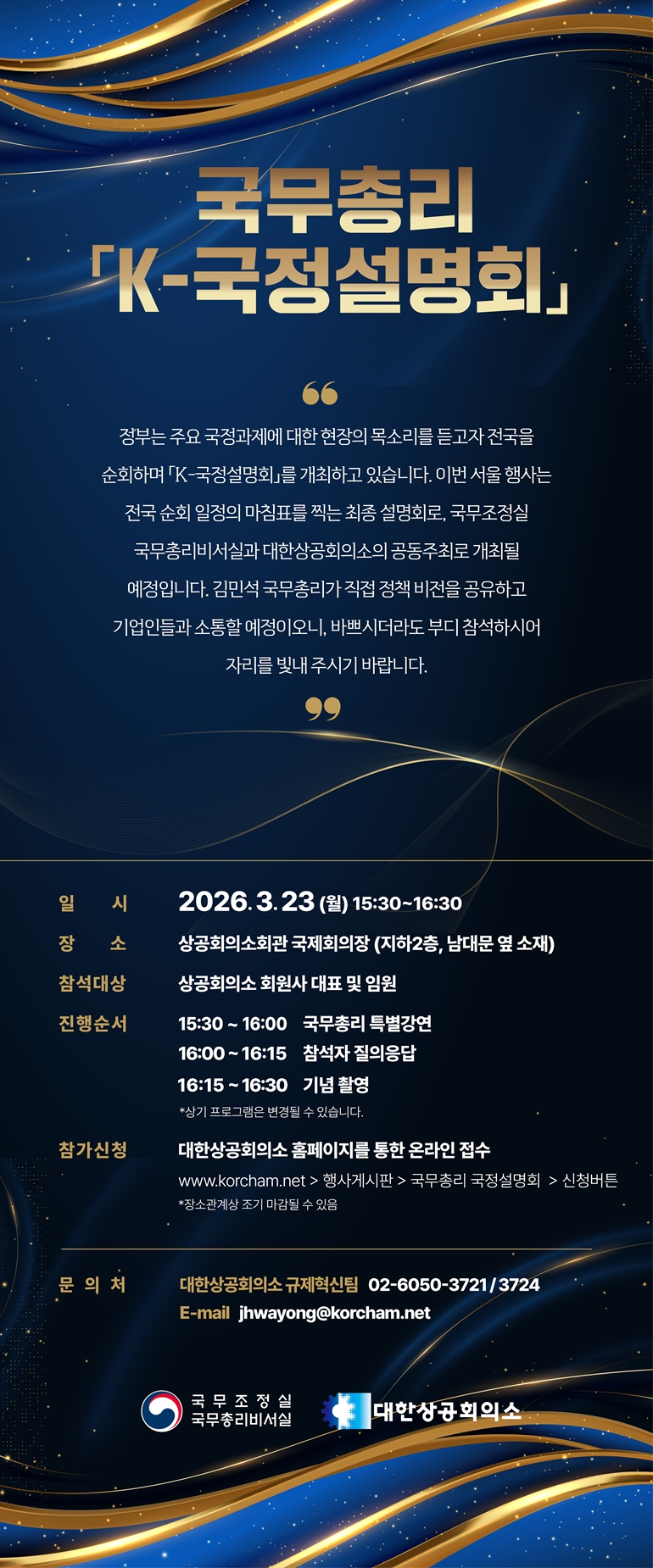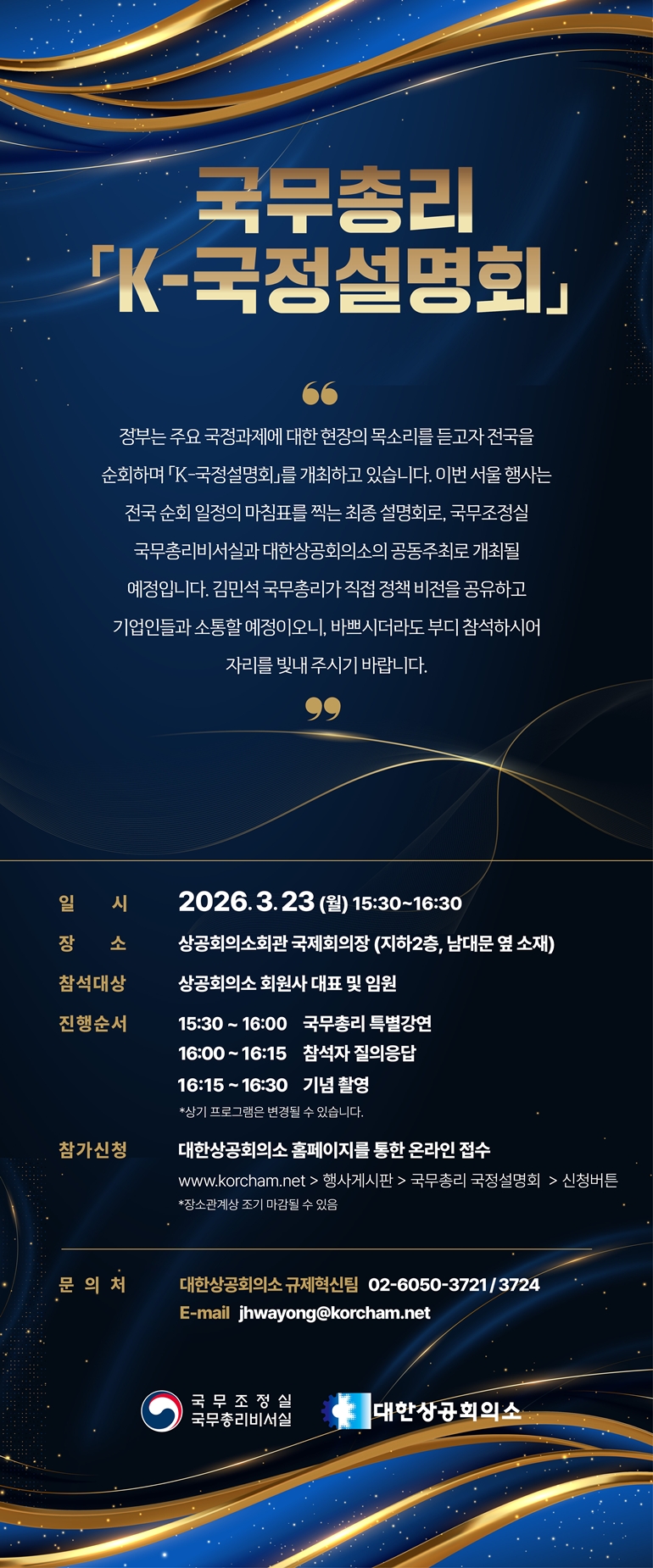 대한상공회의소와 국무총리비서실 공동 주최로 국무총리 초청 K-국정설명회가 개최될 예정입니다.