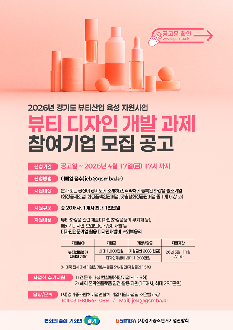 | 제목 | 2026년 경기도 뷰티산업 육성 지원사업-뷰티 디자인 개발 과제 참여기업 모집 공고 | ||